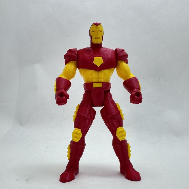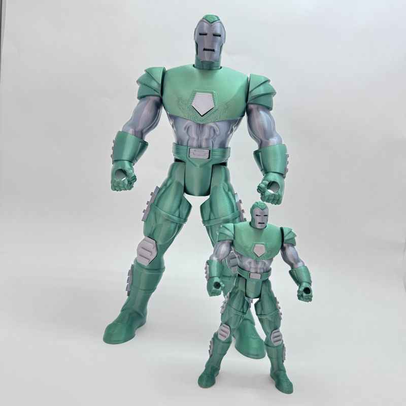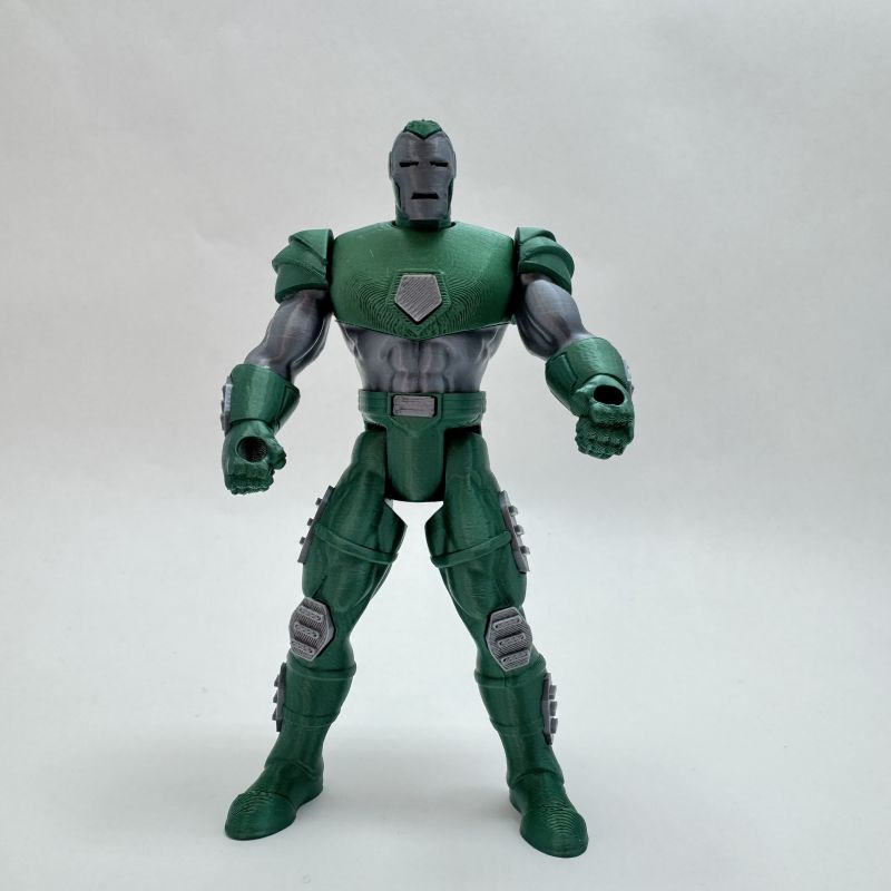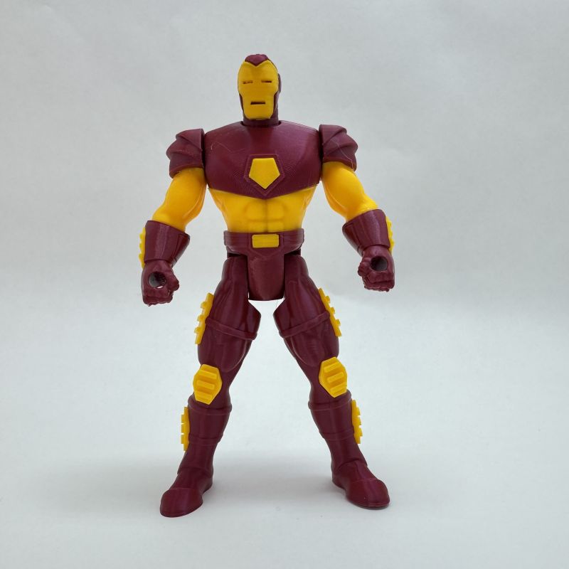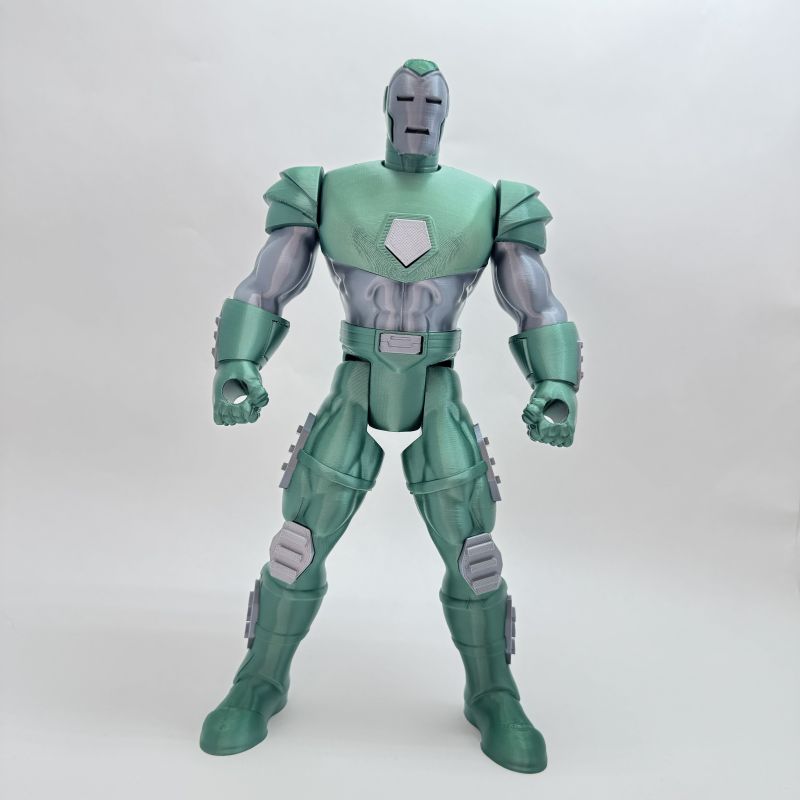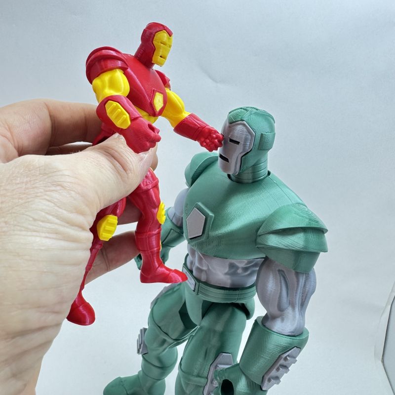 Articulated Iron Man action figure inspired by the 1994 Animated Series. 3D printed, poseable, and available in classic red & gold or Doctor Doom green & silver editions.