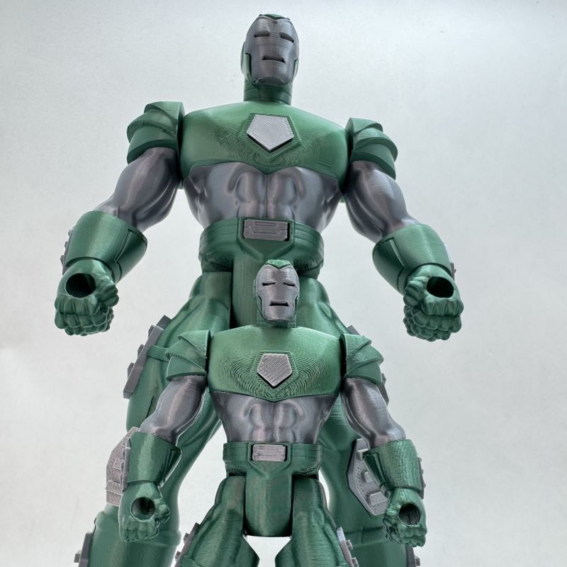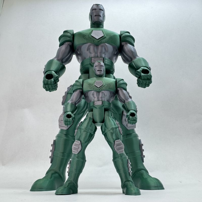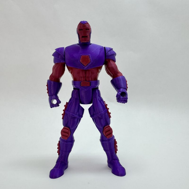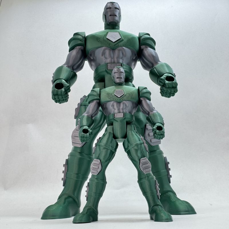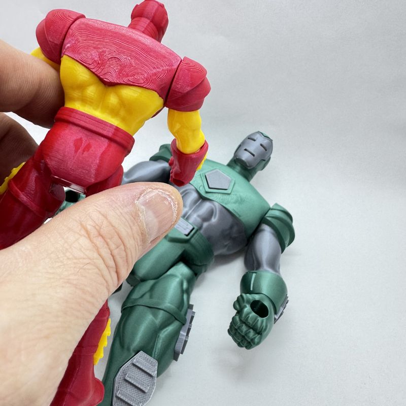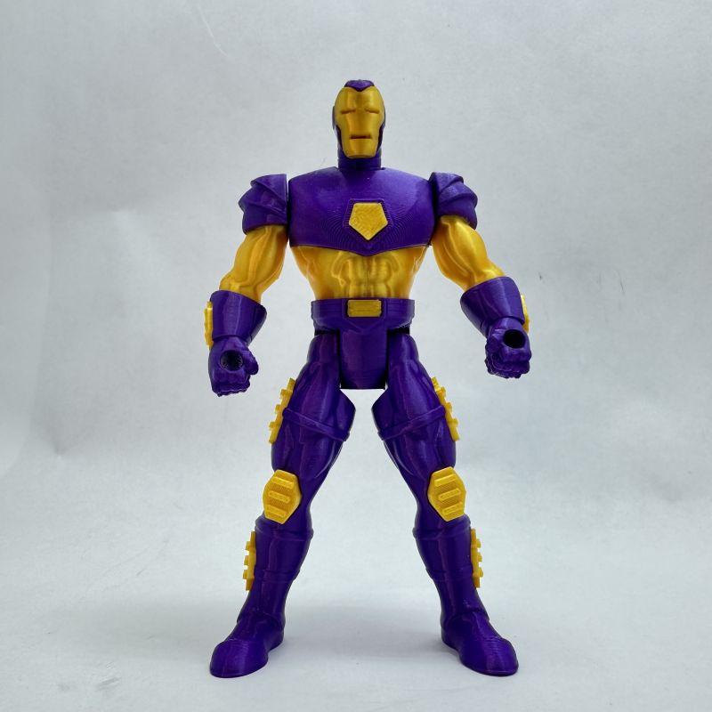 Articulated Iron Man action figure inspired by the 1994 Animated Series. 3D printed, poseable, and available in classic red & gold or Doctor Doom green & silver editions.