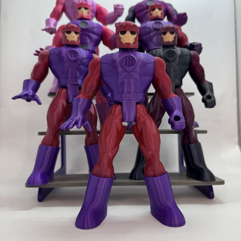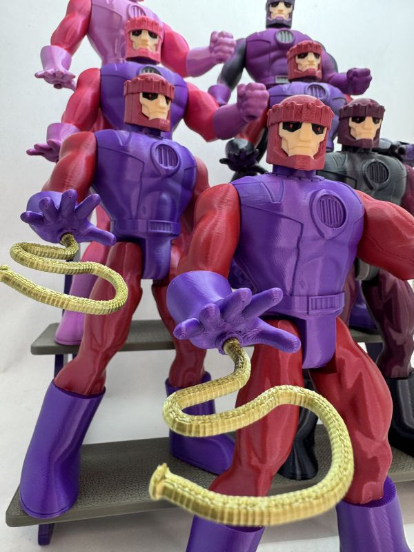 An articulated Sentinel action figure just over 8 inches tall, inspired by classic X-Men villains. 3D printed, assembled, and available in custom colors.