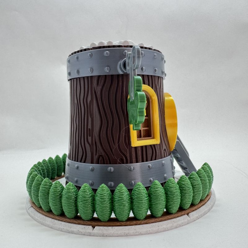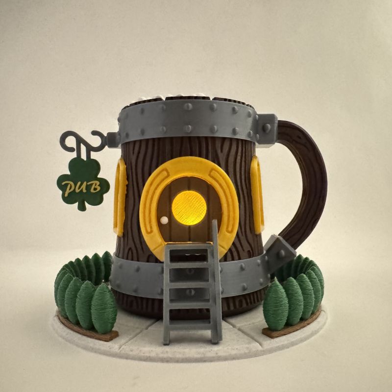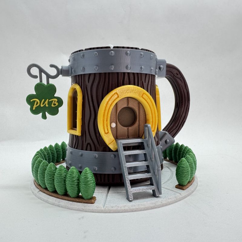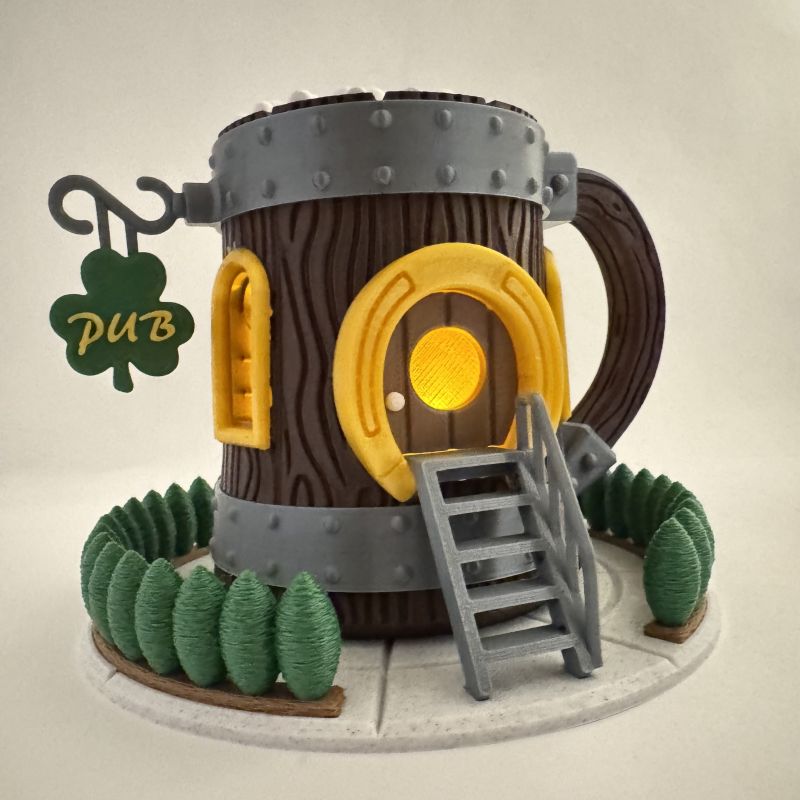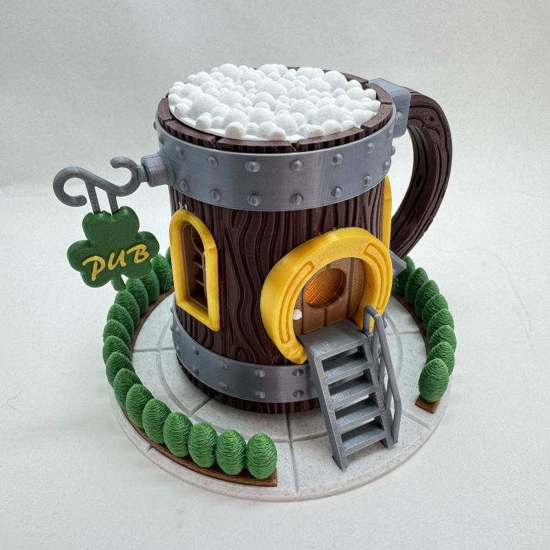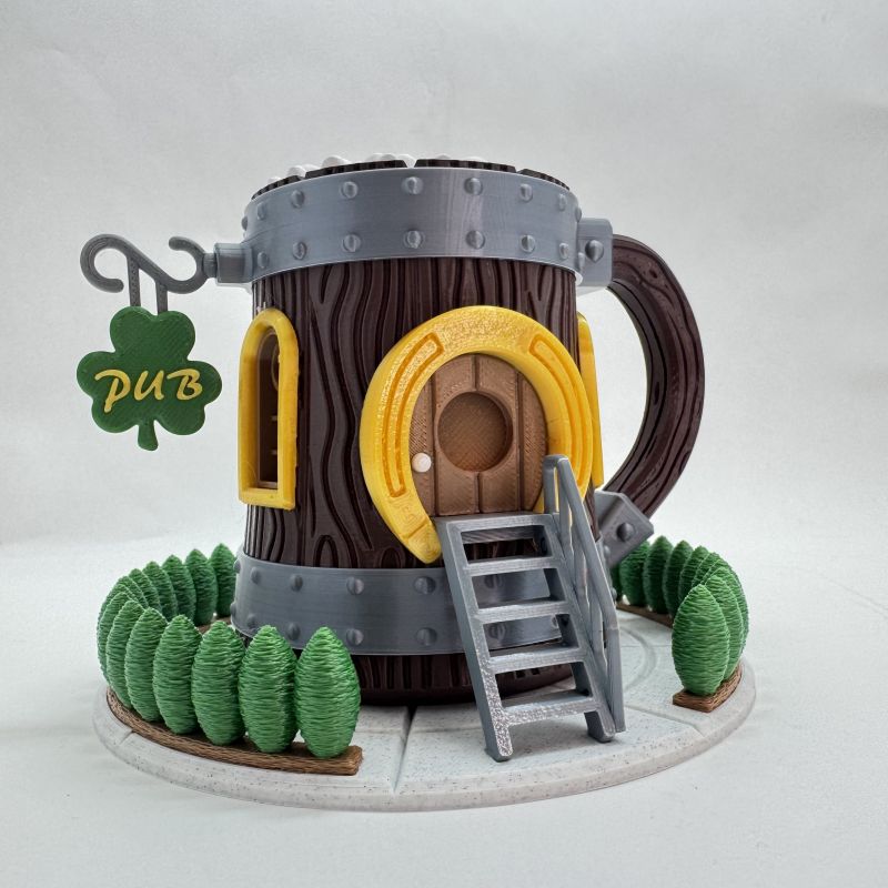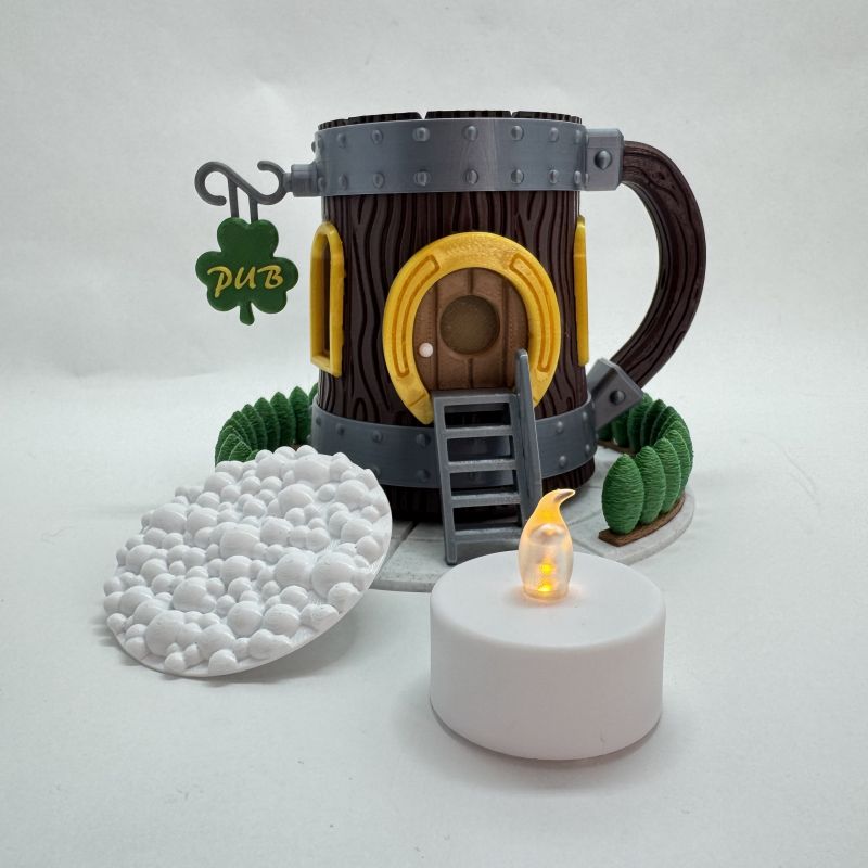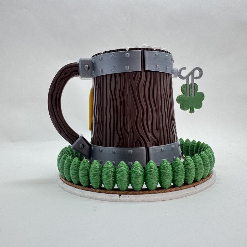 The design features detailed faux wood grain, metallic band accents, and a bold horseshoe doorway. In addition, the shamrock “PUB” sign and sculpted greenery base create a playful Irish pub aesthetic. The foam-textured top completes the mug-inspired look.